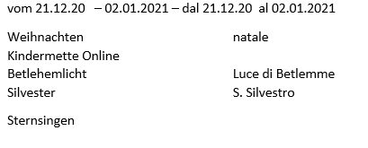 Pfarrbrief – bolletino nr.-20-2020-21.12.20-02.01.2021Herunterladen Ähnliche Beiträge Hinterlasse einen Kommentar Antwort abbrechen