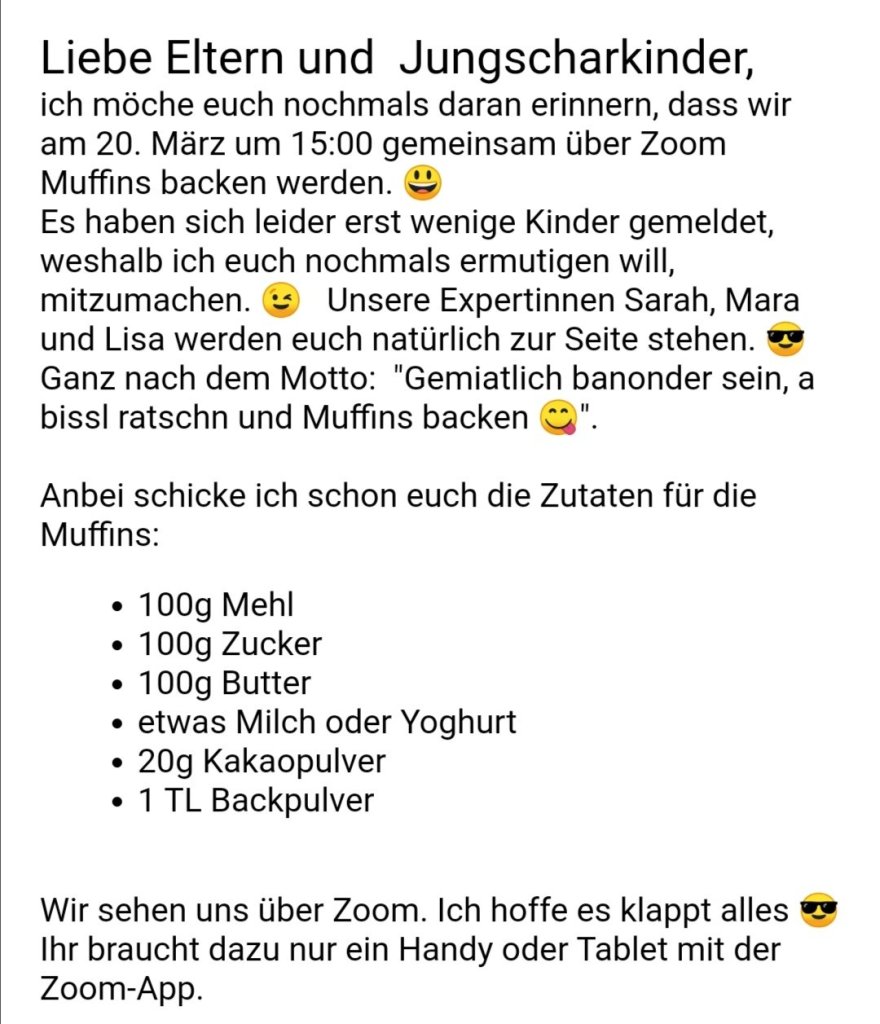 Gemeinsam Kuchen backen Thema: Jungschar Burgstall Muffins BackenUhrzeit: 20.März.2021 03:00 PM RomZoom-Meeting beitretenhttps://us04web.zoom.us/j/76582386293?pwd=Y3YwazZzOVNGc3dpdFJJS0FPTWljdz09Meeting-ID: 765 8238 6293Kenncode: i6GTGs Ähnliche Beiträge Hinterlasse einen Kommentar Antwort abbrechen