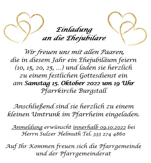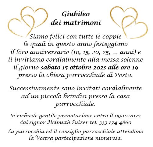 Einladung an die Ehejubilare – Giubileo dei matrimoni Ähnliche Beiträge Hinterlasse einen Kommentar Antwort abbrechen
