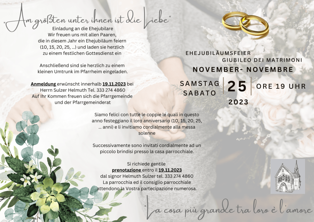 Ehejubiläum – Giubileo dei matrimoni – 25.11.2023 19:00 Ähnliche Beiträge Hinterlasse einen Kommentar Antwort abbrechen