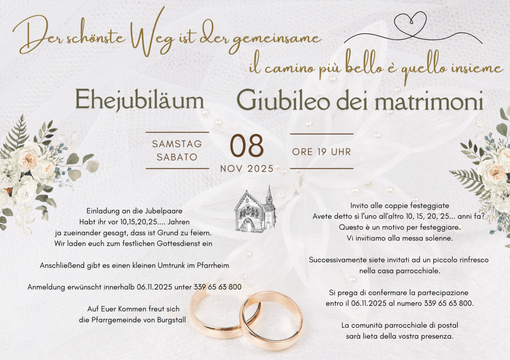 Ehejubiläum – Giubileo dei matrimoni – 08.11.2025 19:00 Ähnliche Beiträge Hinterlasse einen Kommentar Antwort abbrechen